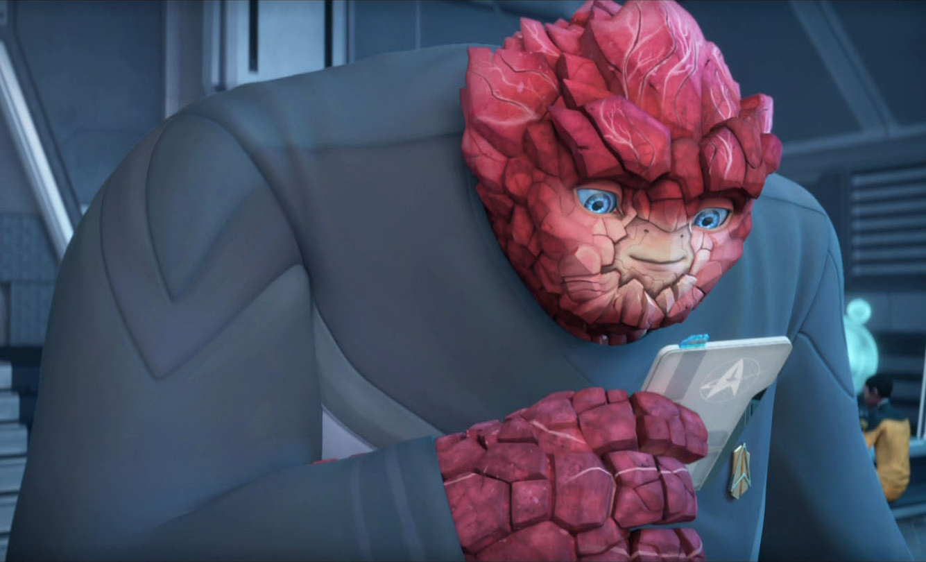 | Rok-Tahk ist eine Brikarianerin (auch: Brikar) und besteht quasi aus Stein. Früher musste sie wegen ihrer Größe als "Monster" Schaukämpfe austragen, bis sie verkauft wurde. Sie wird gemeinsam mit anderen Gefangenen in der Strafkolonie Tars Lamora im Delta-Quadranten festgehalten. Rok ist herzensgut, zurückhaltend und schüchtern, zudem sehr tierlieb. Rok-Tahk schafft mit einigen anderen Gefangenen 2383 mit dem verschollen geglaubten Raumschiff U.S.S. Protostar zu fliehen. Sie möchte nicht kämpfen und ist sehr harmoniebedürftig. An Bord entwickelt sie sich nach und nach zu einer Wissenschaftlerin, auch wenn sie noch nicht weiß was sie am meisten interessiert. Zwar wird die Protostar zerstört, doch Rok tritt genau wie ihre Freunde der Sternenflottenakademie bei, nachdem sie die Zerstörung der Sternenflotte verhindert haben. Admiral Janeway übernimmt die Verantwortung der Ausbildung. Die Brikar entscheidet sich zu einer Ausbildung als Xenobiologin. | |