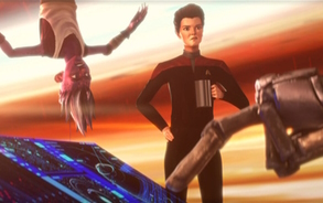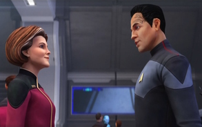 - Die Verbindung zu Star Trek: Voyager erfolgt nicht nur duch das Setting im Delta-Quadranten, sondern auch durch ein Janeway-Hologram, welches von der original Schauspielerin gespielt/synchronisiert wird.