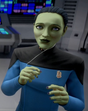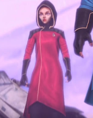 Die Rangabzeichen sind weiterhin am Kragen der Uniform zu sehen. Der Kommunikator unterscheidet sich von dem gleichzeitig verwendeten silbernen Pfeil und hat wieder die bekannten gold und silber Elemente.
