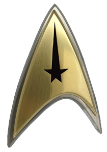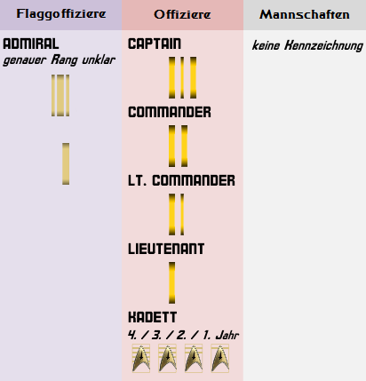 Das bekannte Pfeilsymbol zeigt aber weitehrin mit den Symbolen die Fachbereiche: ein Stern für die Kommandoebene, eine Spirale für Techniker und zwei sich überschneidende Kreise für Wissenschaftler und Mediziner. Die Rangkennzeichnung erfolgt bei diesem Uniformtyp über Streifen am Ärmel, zunächst in der eigentlichen Uniformfarbe, später in gold und silber (Medizin): Kadetten und einfache Crewmen haben keine Streifen, Ensign einen schmalen, Lieutenants einen dicken, Lt. Commander einen schmalen und einen dicken, Commander zwei dicke und Captains einen schmalen der von jeweils einem dicken Streifen darüber und darunter eingerahmt wird.