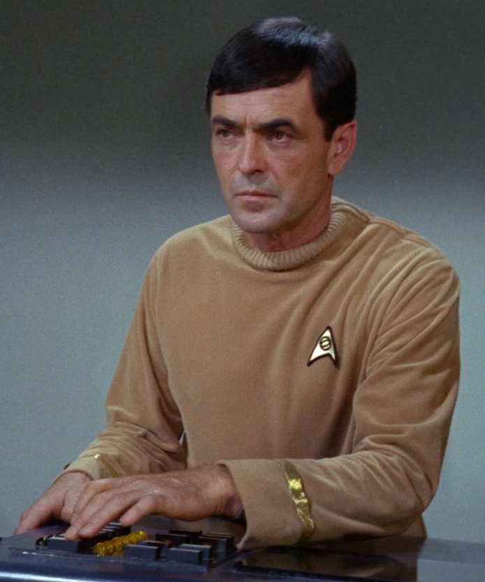 (Obwohl dem Schauspieler ein Finger fehlte, wird dies in TOS immer kaschiert. Dabei hätte man aus heutiger Sicht gerade bei einem Ingenieur so etwas gut in die Story des Charakters mit einbauen können.)