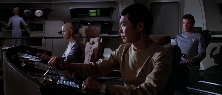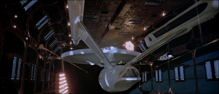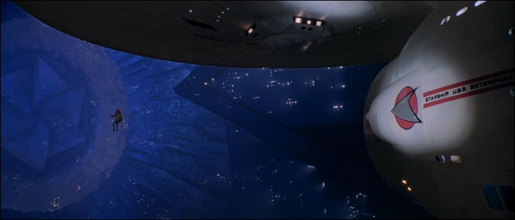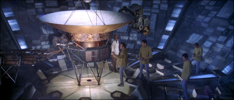 ![]() Die umgerüstete Enterprise liegt noch im Raumdock der Erde, als ein mächtiges Schiff quer durch den klingonischen Raum auf den Planeten zuhält. Alle Angriffe bleiben wirkungslos, Schiffe und Stationen in seinem Weg werden scheinbar aufgelöst, später stellt sich heraus, dass sie digitalisiert und in Informationen umgewandelt wurden. Der zum Admiral beförderte Kirk übernimmt das Kommando der Enterprise und der eigentliche neue Kommandant Will Decker wird zum Wissenschaftsoffizier herabgestuft. Als die Enterprise in das gewaltige Raumschiff eindringt, stellt sich schließlich heraus, dass das V'Ger genannte Schiff in Wahrheit die Raumsonde Voyager VI von der Erde ist. Sie wurde von Unbekannten aufgerüstet und zurück zu ihren Erbauern geschickt, um ihren Auftrag zu beenden: Die Sonde sollte alles Wissen sammeln und alles Erlernbare lernen und diese Daten zurück zur Erde senden. Letzen Endes gelingt es durch das Opfer Deckers die Sonde aufzuhalten und die Erde wird gerettet.