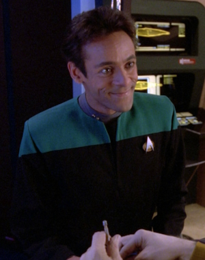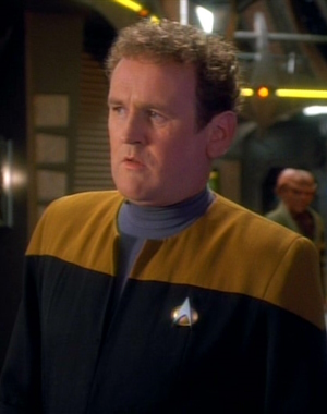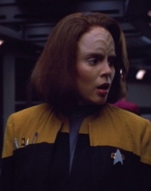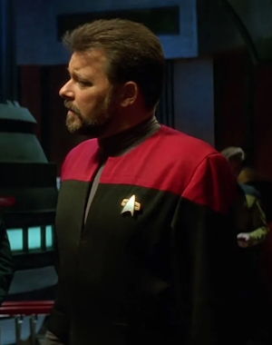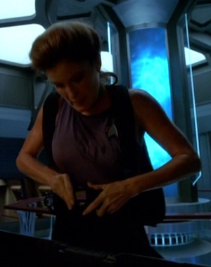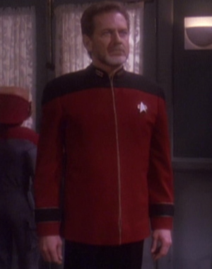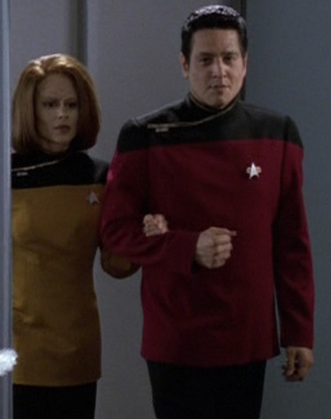 Die als Ergänzung zur 2366er Uniform gedachte Arbeitsuniform wird zunächst auf Raumstationen wie Deep Space 9 eingesetzt. Sie ähnelt mehr einem praktischen Overall. Diese Uniformvariante integriert sich jedoch mehr und mehr in der Flotte, sodass sie die vorherige Version ersetzt. Sie wird zum Beispiel auf der Voyager einheitlich von der Crew getragen. Die Farben sind umgekehrt, samit sind die Schultern in der jeweiligen Abteilungsfarbe, während die restliche Uniform schwarz gehalten ist. Die Abteilungsfarben ansich bleiben erhalten: rot für die Kommandoebene, gold/gelb bei der Sicherheit/Technik und für Wissenschaft/Medizin blau. Die Uniformen sind für beide Geschlechter identisch. Ingenieure haben die Option eine zusätzliche Jacke zu tragen, in der auch kleinere Werkzeuge verstaut werden können. Die Galauniform bleibt erhalten, wird aber erneut gekürzt und verliert ihr Kleid-Image. Auch die bekannte Admiralsuniform hat weiterhin bestand. Neben den normalen Uniformen, gibt es natürlich auch Raumanzüge. Kadetten tragen zu dieser Zeit vergleichbare Uniformen wie zuvor, es wurde lediglich nach einiger Zeit das Schwarz mit einem Grau ersetzt. Außerdem ist das Ausbildungsjahr nicht mehr am Kragen zu erkennen. Auf der Voyager haben die in die Crew integrierten Maquis-Mitglieder provisorische Sternenflottenränge mit alternativen Rangabzeichen erhalten, tragen ansonsten aber die normalen Uniformen. |