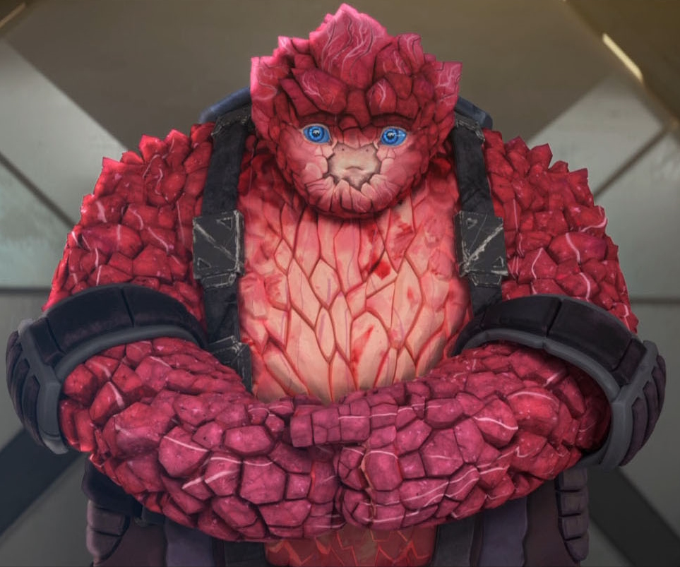 | Rok-Tahk ist eine Brikarianerin (auch: Brikar) und besteht quasi aus Stein. Früher musste sie wegen ihrer Größe als "Monster" Schaukämpfe austragen, bis sie verkauft wurde. Sie wird gemeinsam mit anderen Gefangenen in der Strafkolonie Tars Lamora im Delta-Quadranten festgehalten. Rok ist herzensgut, zurückhaltend und schüchtern, zudem sehr tierlieb. Rok-Tahk schafft mit einigen anderen Gefangenen 2383 mit dem verschollen geglaubten Raumschiff U.S.S. Protostar zu fliehen. Sie möchte nicht kämpfen und ist sehr harmoniebedürftig. An Bord entwickelt sie sich nach und nach zu einer Wissenschaftlerin, auch wenn sie noch nicht weiß was sie am meisten interessiert. Zwar wird die Protostar zerstört, doch Rok tritt genau wie ihre Freunde der Sternenflottenakademie bei, nachdem sie die Zerstörung der Sternenflotte verhindert haben. Admiral Janeway übernimmt die Verantwortung der Ausbildung. Die Brikar entscheidet sich zu einer Ausbildung als Xenobiologin. | |