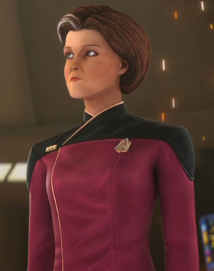 Die Rangabzeichen sind weiterhin am Kragen der Uniform zu sehen. Der Kommunikator unterscheidet sich von dem gleichzeitig verwendeten silbernen Pfeil und hat wieder die bekannten gold und silber Elemente.