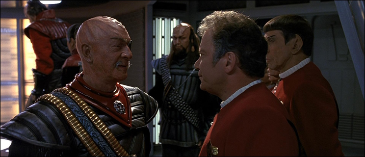 ![]() Die Excelsior, unter dem Kommando von Captain Sulu, befindet sich in der Nähe der klingonischen Grenze, als der klingonische Mond Praxis explodiert, der für die Hauptenergieversorgung der klingonischen Heimatwelt Qo'noS zuständig war. Durch diesen Zwischenfall benötigen die Klingonen die Unterstützung der Föderation und es wird beschlossen in Verhandlungen mit dem alten Erzfeind zu treten. Die Enterprise soll den klingonischen Kanzler Gorkon Richtung Erde eskortieren. Kirk weigert sich zunächst, da er alle Klingonen für den Tod seines Sohnes verantwortlich macht, kann jedoch von Spock, welcher als Sonderbotschafter agiert, überzeugt werden das Richtige zu tun. Als die Enterprise Gorkons Schiff eskortiert, wird ein Attentat auf das klingonische Schiff verübt. Zunächst wird das Schiff beschossen und da kein anderes Raumschiff in der Nähe ist, vermutet man, dass es von der Enterprise aus geschah. Als sich zwei in Föderationsraumanzüge gekleidete Personen auf das driftende klingonische Schiff beamen, bringen sie den Kanzler an Bord um. Kirk, der mit McCoy direkt an Bord beamt um den Kanzler zu retten, wird zusammen mit seinem Schiffsarzt festgenommen und der klingonischen Gerichtsbarkeit übergeben. Dort werden beide wegen der neuen „Freundschaft“ zwischen Klingonischem Reich und der Föderation nicht zum Tode, sondern zur Zwangsarbeit in den Dilithiumminen des Eisplaneten Rura Penthe verurteilt. Währenddessen forscht man an Bord der Enterprise weiterhin fieberhaft nach den Verursachern des Angriffs. Kurz darauf stößt man an Bord der Enterprise schließlich auf Beweise von Valeris Teilnahme am Anschlag. Die Vulkanierin ist Spocks Schülerin, welche unter einer erzwungenen Geistesverschmelzung ihre Beteiligung zugibt. Zudem erfährt Spock, dass auf die Tochter des toten Kanzlers, Azetbur, welche nun ihrerseits das Reich führt, auf dem Planeten Kithomer ebenfalls ein Anschlag verübt werden soll Die Crew entschließt sich zunächst zur Rettung der beiden Gefangenen, was knapp gelingt und macht sich auf den Weg nach Khitomer macht. Es stellt sich heraus, dass von einem getarnten Bird of Prey auf das andere klingonische Schiff geschossen wurde. Gemeinsam mit der Excelsior stellt die Enterprise den Bird of Prey und vernichtet ihn. Auf Khitomer haben sich die Föderationsdelegierten und die Klingonen zu Friedensverhandlungen getroffen. In letzter Sekunde kann die Crew der Enterprise den Anschlag, welcher von hohen Sternenflottenmitgliedern geleitet wurde, verhindern. Die Verhandlungen führen schließlich zum Khitomer-Abkommen und einem Friedensvertrag mit den Klingonen. Die Enterprise wird nach diesem letzten Auftrag eingemottet und die Führungscrew geht in den Ruhestand. |